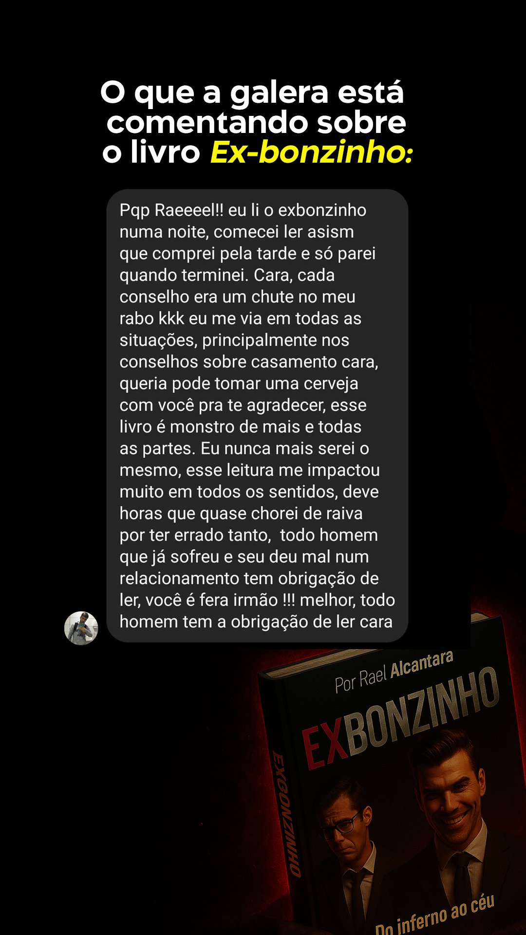 ExBonzinho é um verdadeiro despertar. Neste livro, Rael Alcantara revela o caminho para deixar de ser o bonzinho demais e se tornar um homem seguro, respeitado e desejado, sem precisar mudar quem você é, mas aprendendo a se valorizar de verdade